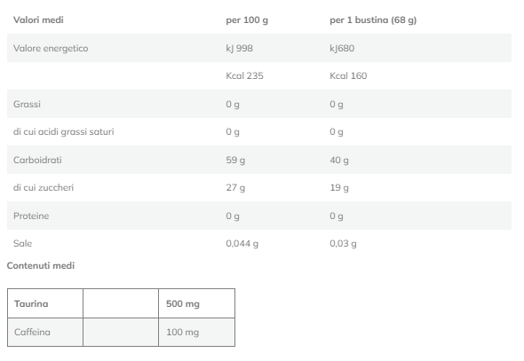 Il rapporto Maltodestrine/Monosaccaridi 2:1 permette un assorbimento compatibile con i limiti di efficienza del trasporto intestinale consentendo assunzioni fino a 90 g di carboidrati/ora di attività.